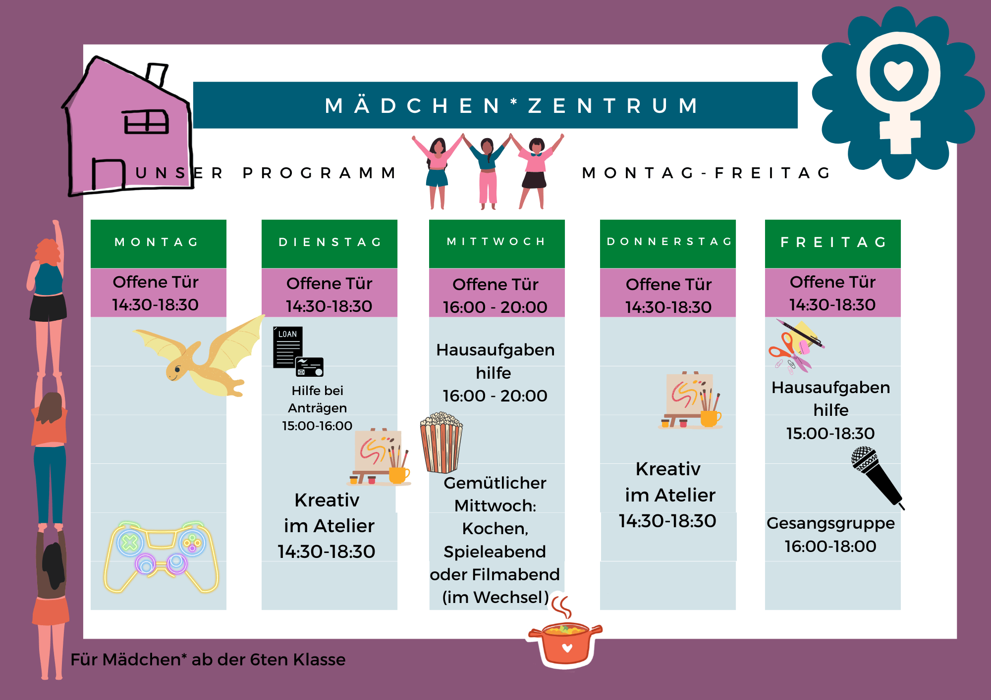 Öffnungszeiten Montag: 14:30-18:30 Uhr Dienstag: 14:30-18:30 Uhr Mittwoch: 16:00-20:00 Uhr Donnerstag: 14:30-18:30 Uhr Freitag: 14:30-18:30 Uhr gefördert von der Senatorin für Soziales, Jugend, Integration und Sport